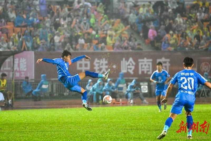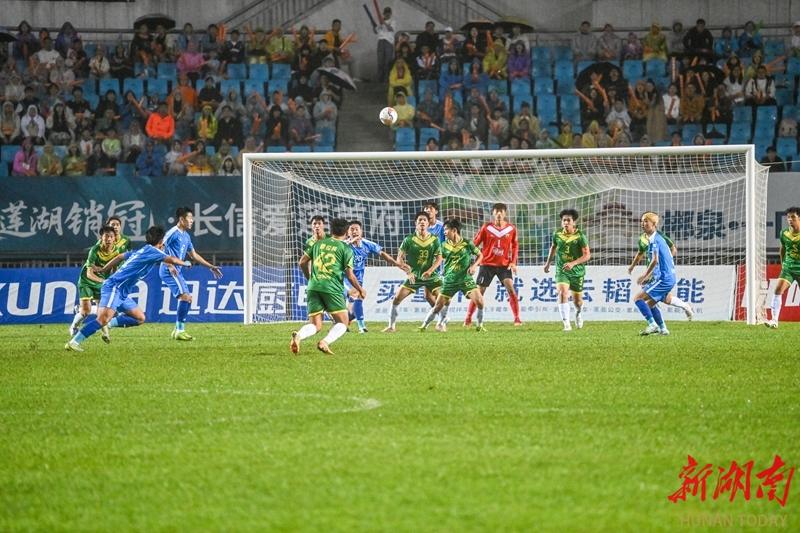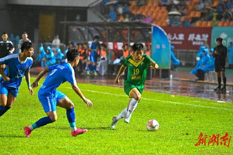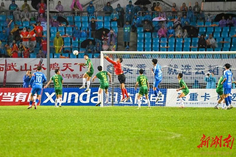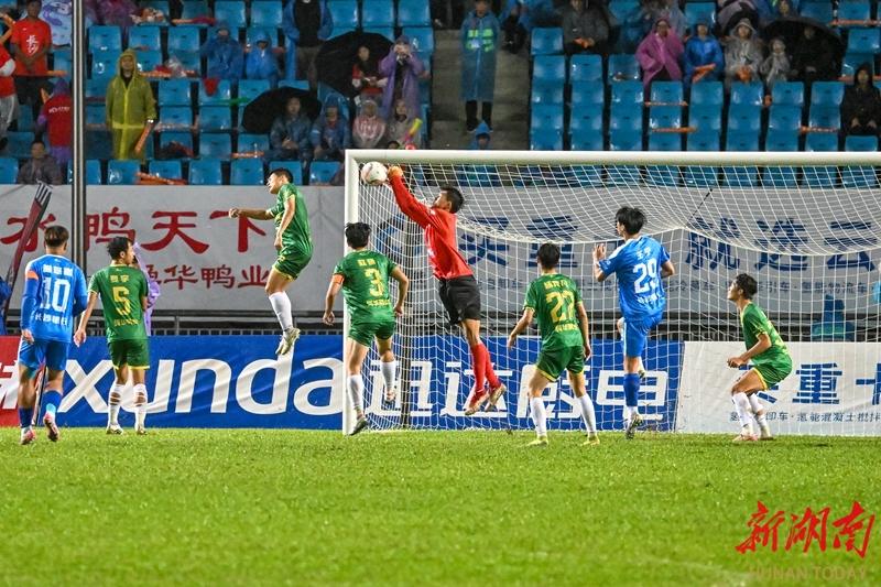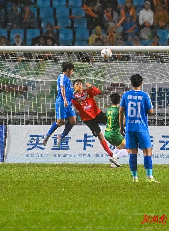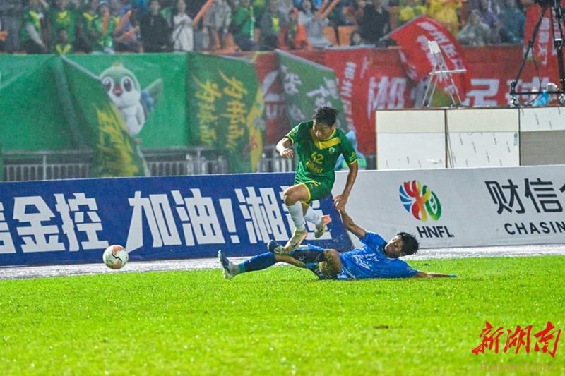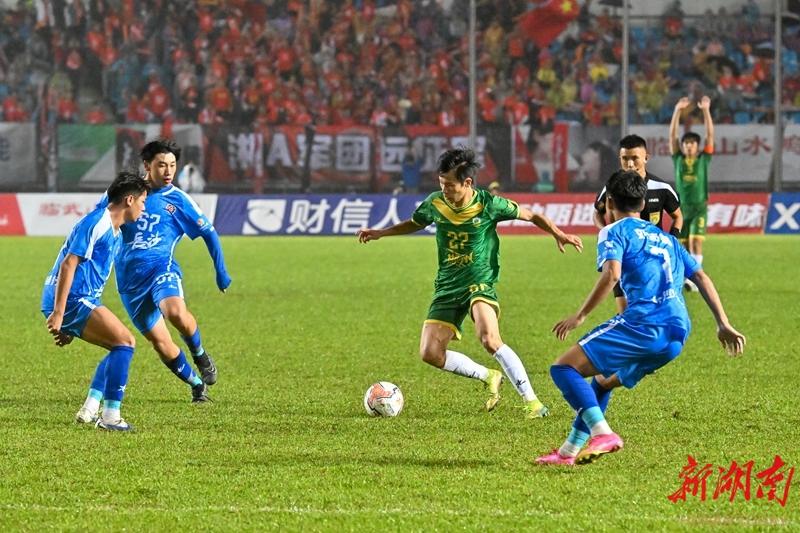 9月20日晚,郴州市体育中心,两队球员在比赛中奋力拼抢。当天,2025湖南省足球联赛(简称“湘超联赛”)郴州队坐镇主场迎战长沙队,最终0比0战平对手。陈哲君 摄(湖南图片库)