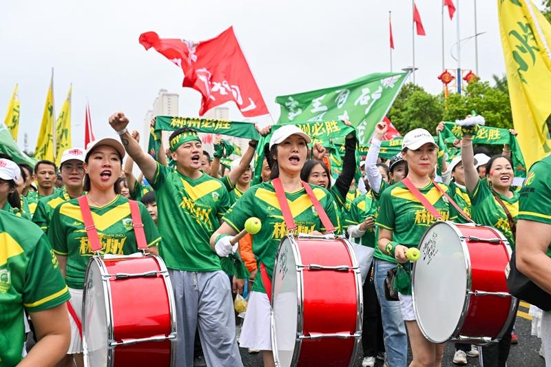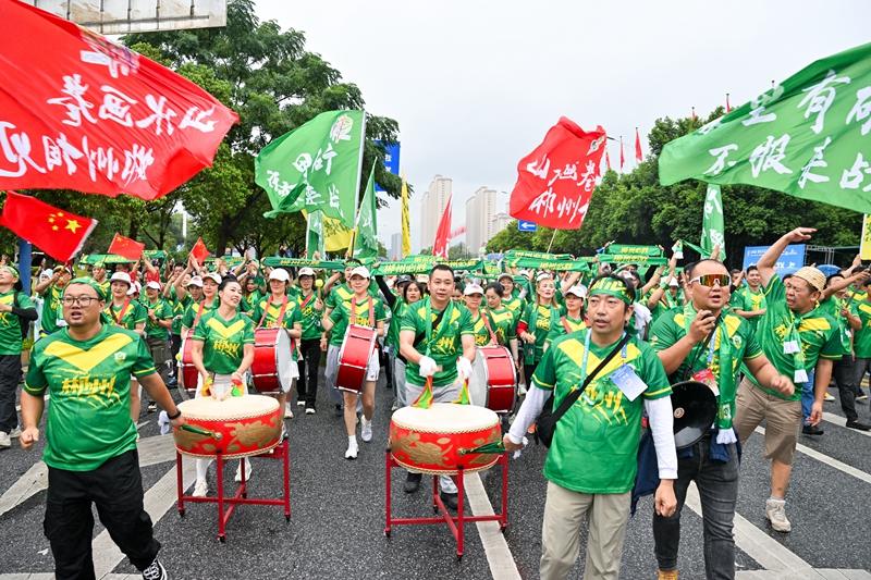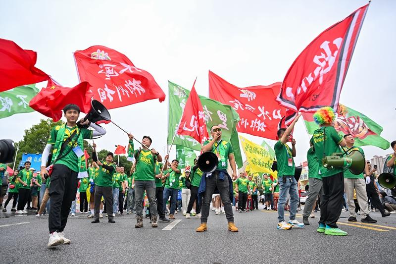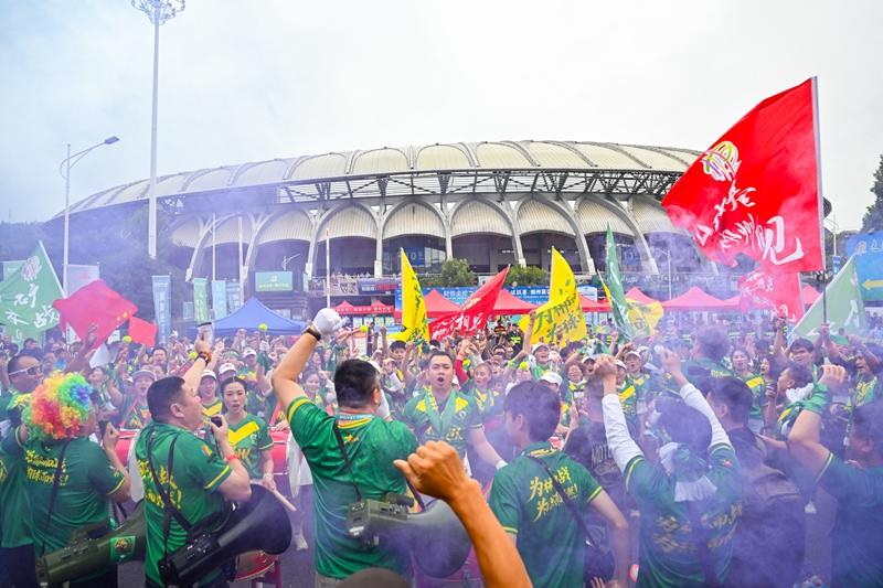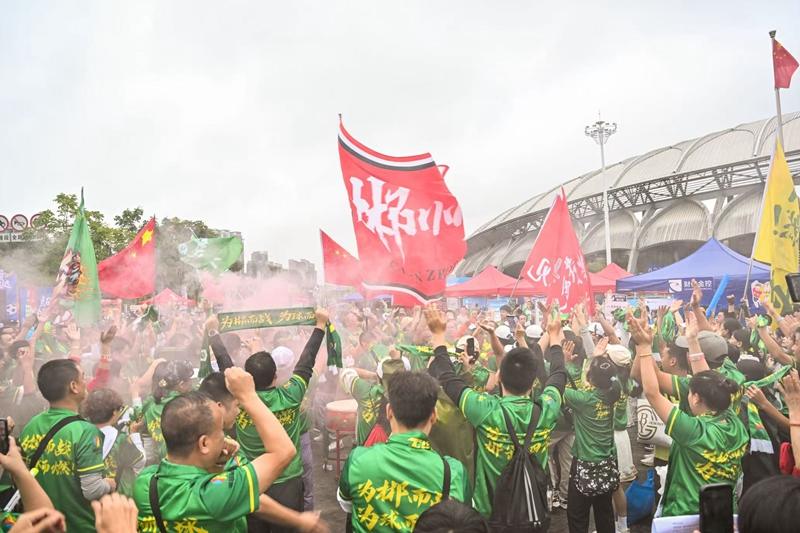 9月20日,球迷早早来到体育中心场外集结,为郴州队助威。当天,2025湖南省足球联赛(简称“湘超联赛”)郴州队坐镇主场迎战长沙队,最终0比0战平对手。陈哲君 摄(湖南图片库)
