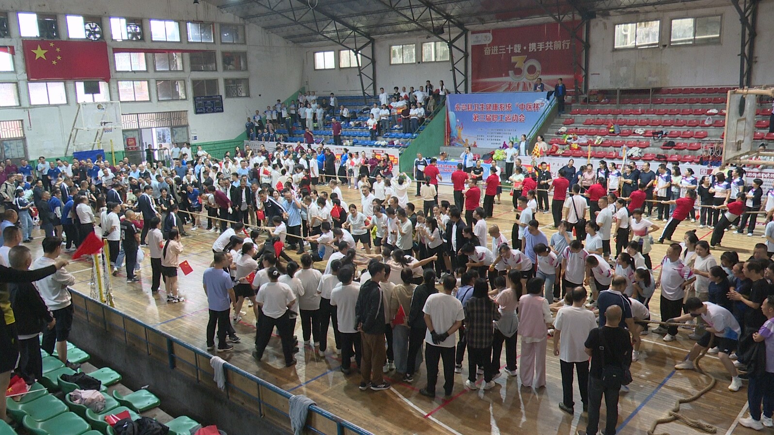 运动会在激昂的运动员进行曲中拉开帷幕。运动会共设气排球、拔河两个比赛项目,参加这次运动会的有全县卫生健康系统各个医疗卫生单位,气排球赛有23支参赛队伍,拔河赛有24支参赛队伍,总计47支参赛队伍、500余名运动员。