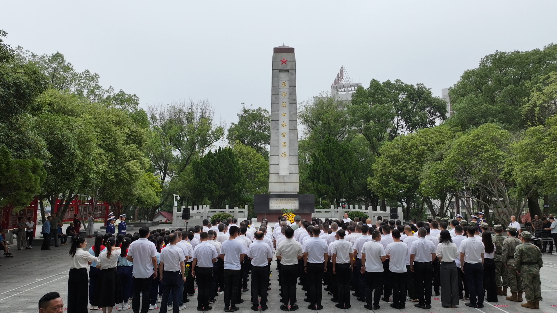 秋日的烈士陵园内,松柏苍翠挺拔,烈士纪念碑巍然矗立,庄严肃穆的氛围感染着在场每一个人。9时整,仪式开始,全场齐声高唱中华人民共和国国歌。