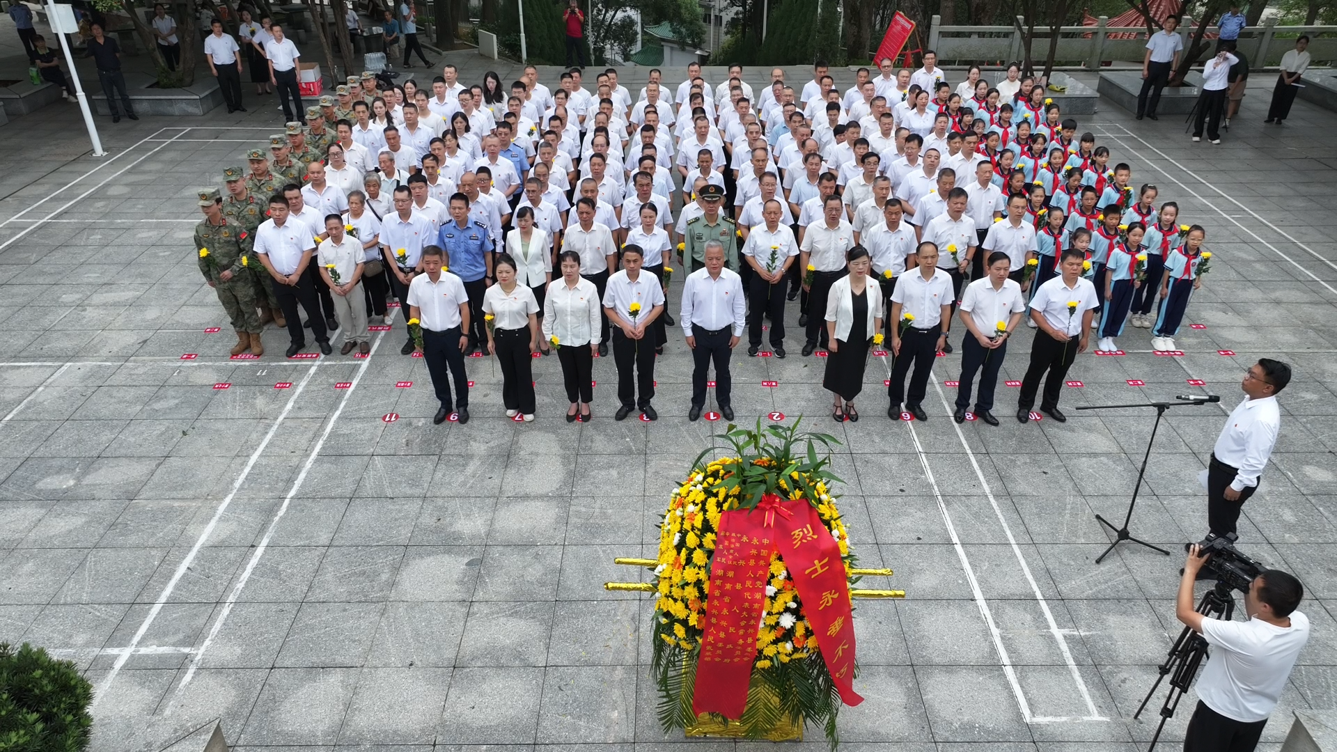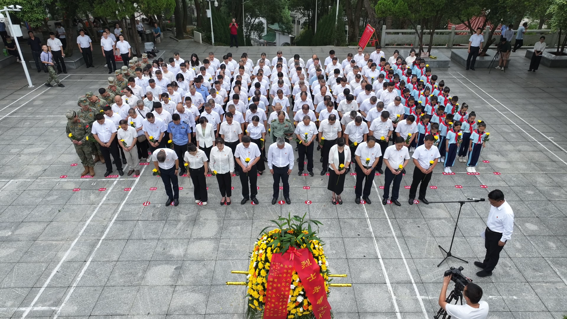 国歌唱毕,全场肃立,向烈士默哀。