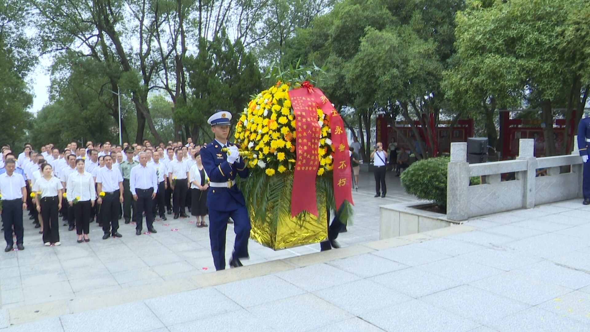 花篮红色缎带上“烈士永垂不朽”的金色大字熠熠生辉,寄托着对英烈的无限哀思和崇高敬意。