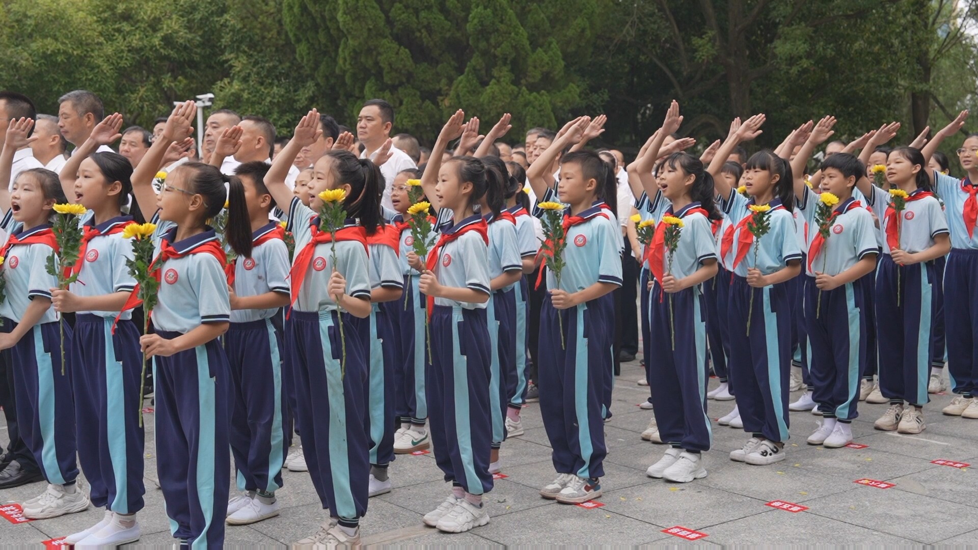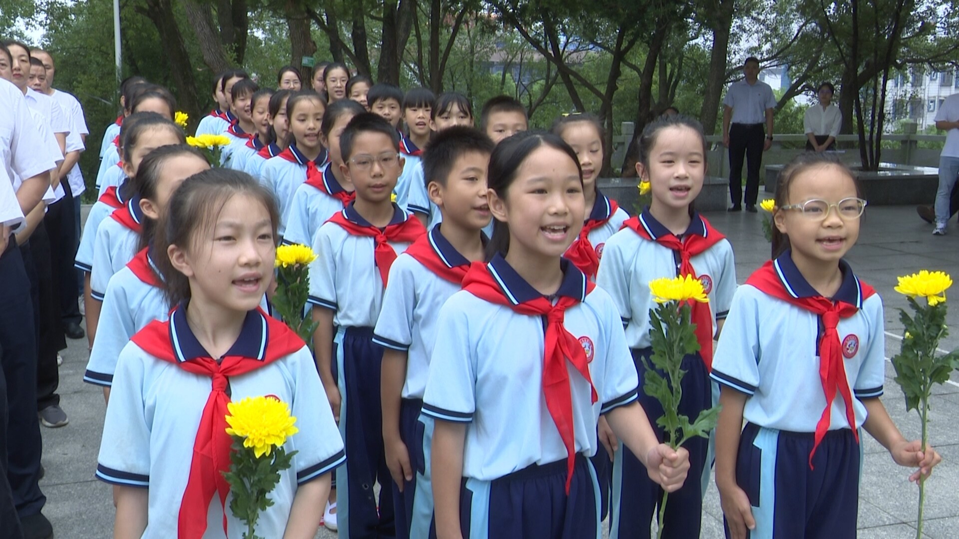 随后,少先队员们齐唱《我们是共产主义接班人》,向烈士致敬。