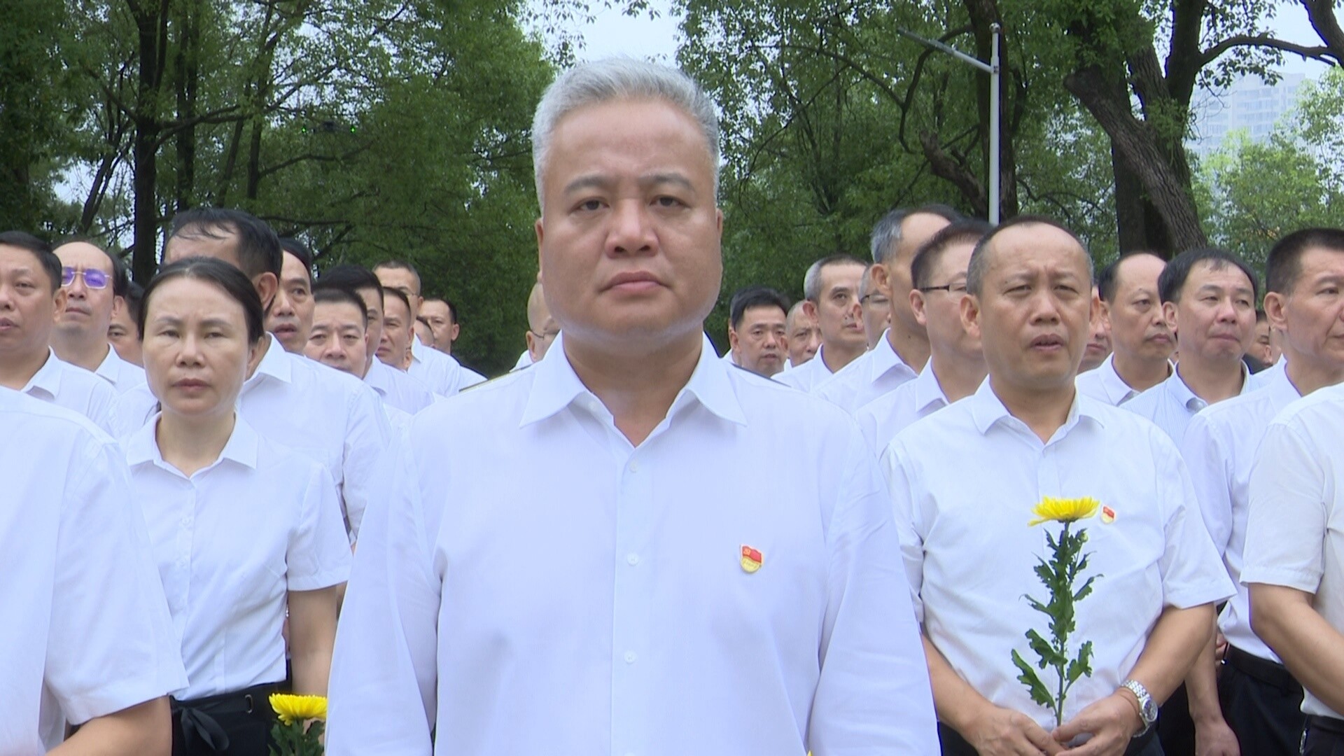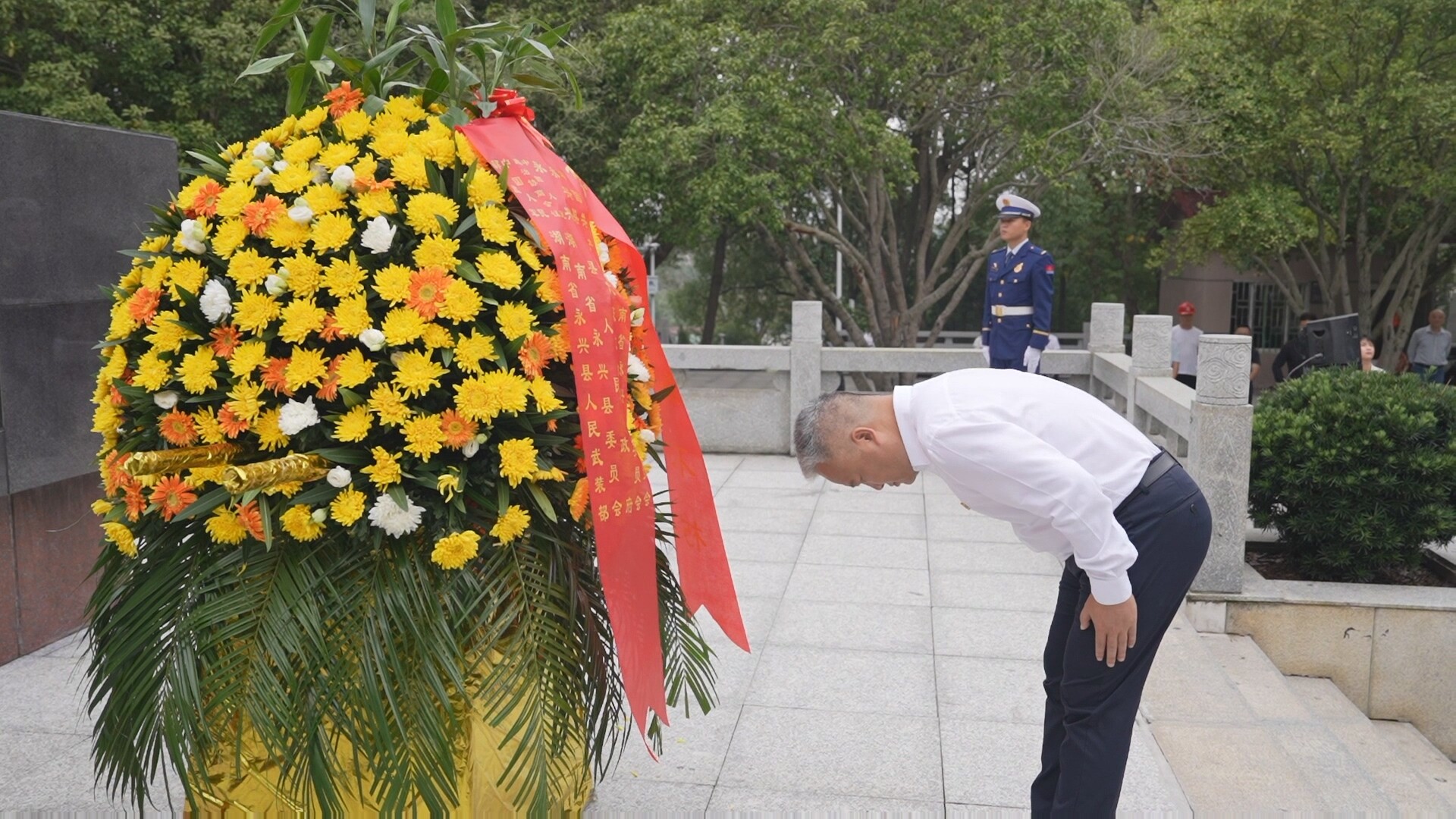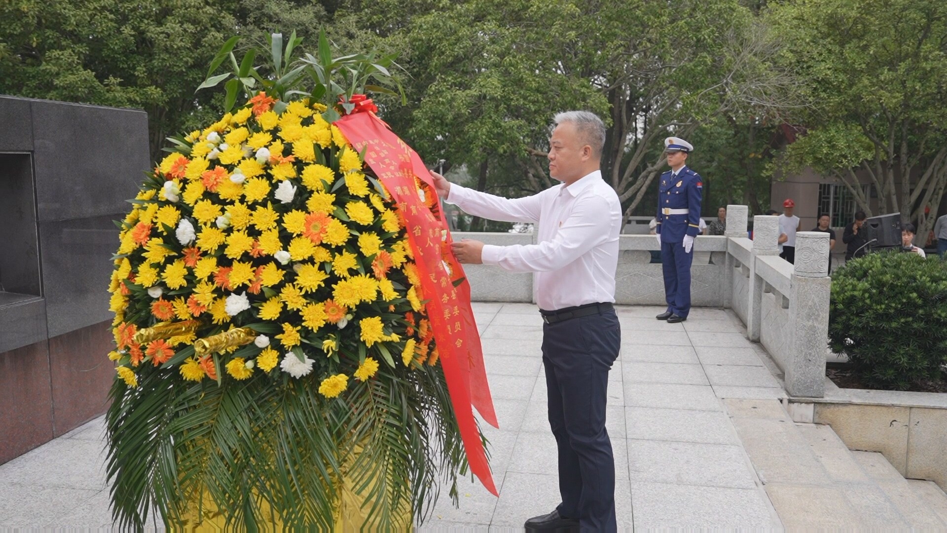 刘朝晖缓步走到花篮前,驻足凝视,仔细整理缎带。