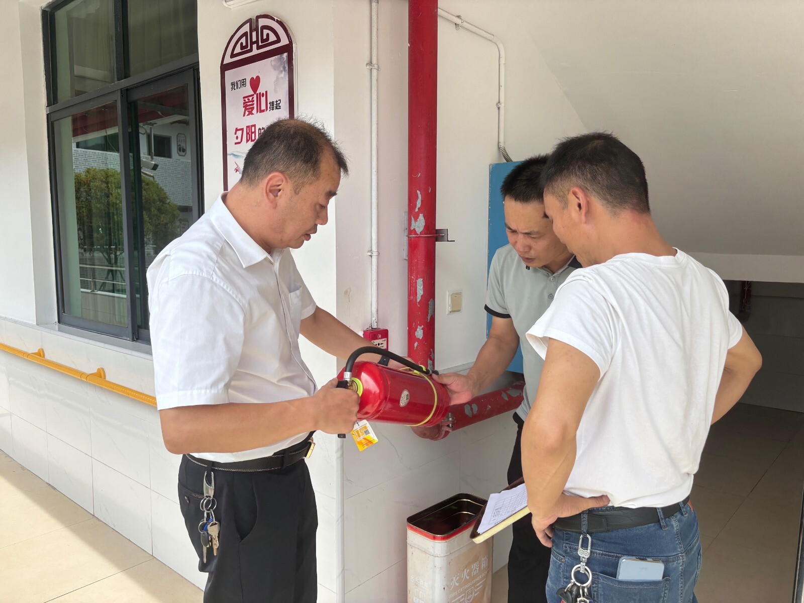 聚焦高频风险领域,深入宿舍、食堂、活动室等关键区域开展细致排查:在消防安全方面,逐一核查灭火器、消火栓、防毒面具、疏散标识、应急照明、火灾自动报警系统等设施的完好性,清理遮挡消防设施堆放的杂物,及时更新消防安全“三自主两公开一承诺”公示牌信息并纠正相关问题;食品安全环节,严格查验食材采购台账、从业人员健康证及食品留样记录等。