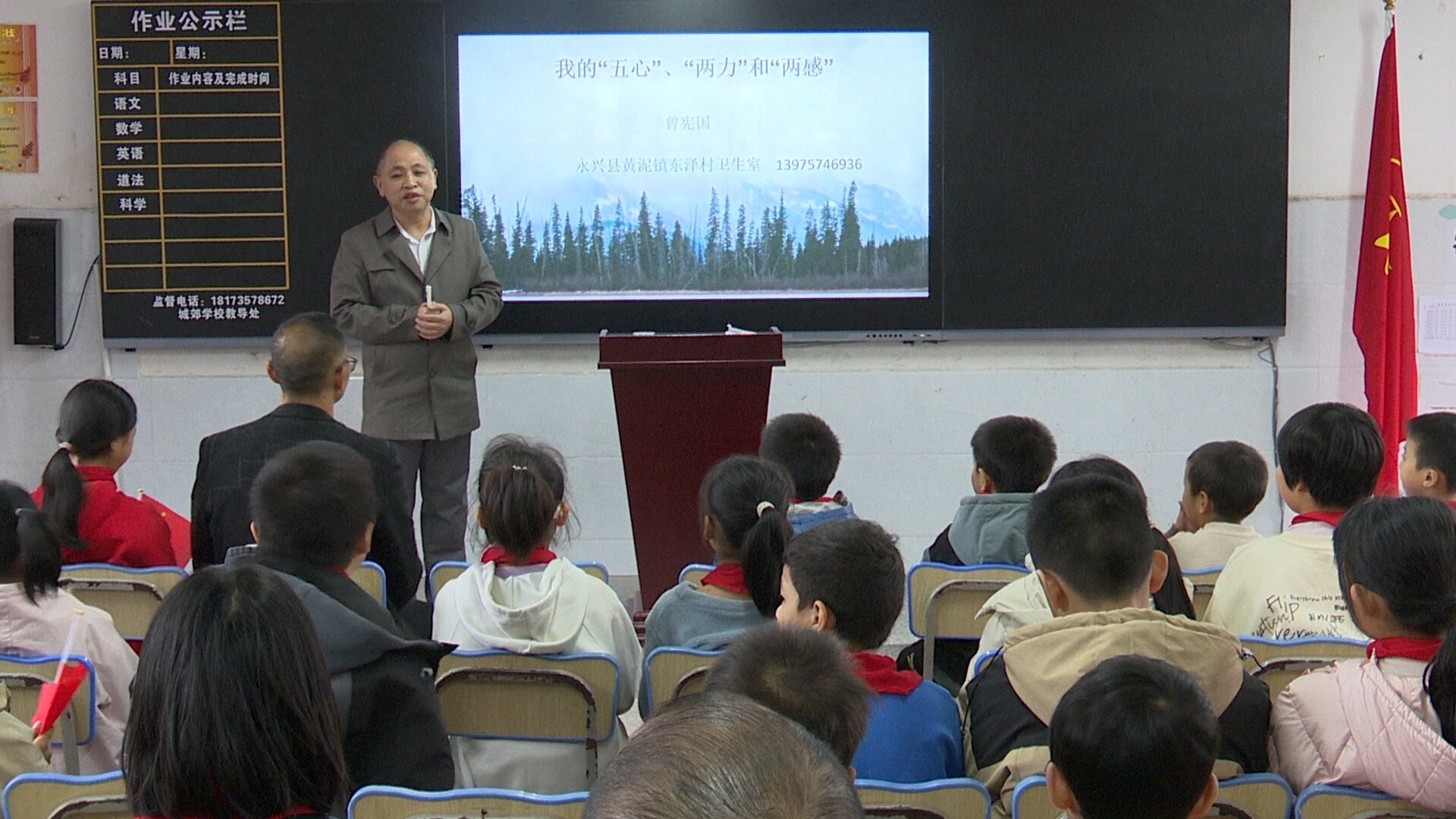 湖南日报·新湖南客户端10月24日讯(通讯员 李华)10月23日,全国劳模、全国优秀共产党员曾宪国走进永兴县便江街道城郊学校,开展“百优榜样进校园”主题宣讲活动。曾宪国以《当一名医生应具有的“五心”“两力”和“两感”》为题,详细阐述了一名医生应该具有的基本素质。