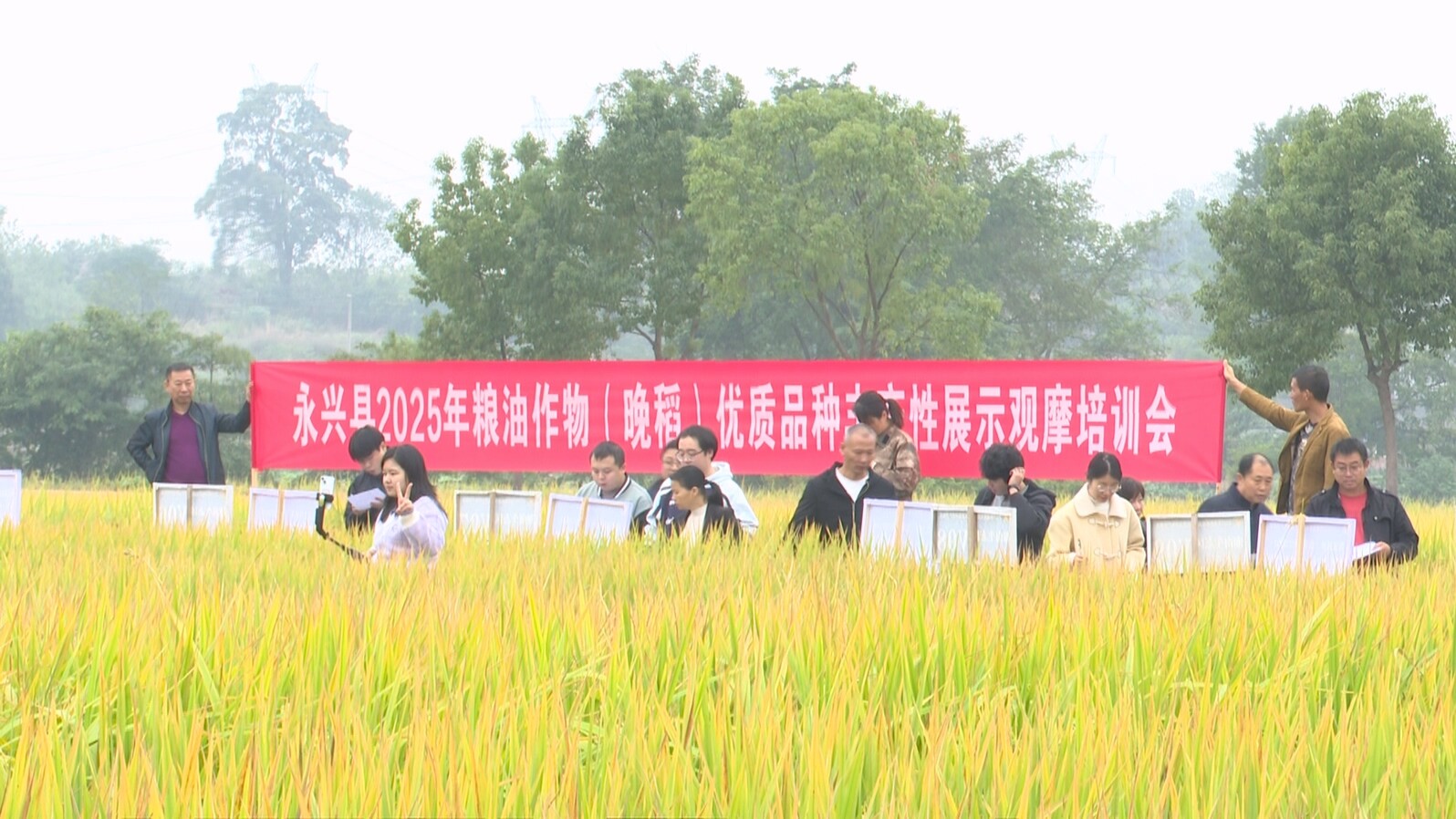 湖南日报·新湖南客户端10月28日讯(通讯员 郭志义 邓延军 张志群)10月27日,永兴县2025年晚稻优质品种丰产性展示现场观摩培训会在便江街道乌泥村举行。来自全县的种粮大户、种子企业代表、稻米加工企业负责人及农业技术人员等76名行业骨干齐聚一堂,通过“田间观摩 + 经验交流”模式,为全县水稻大面积单产提升筛选核心技术支撑。