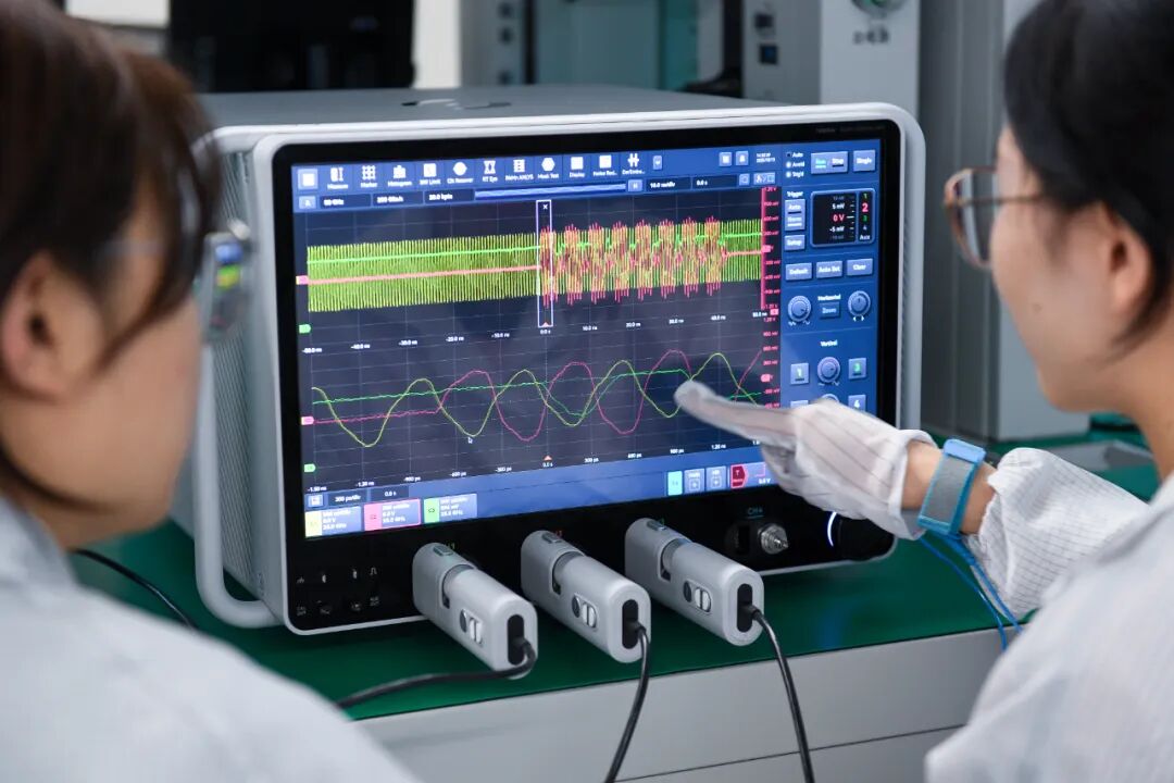 示波器是科技与产业上游的关键装备,广泛应用于产品科学研究、开发测试和生产制造,它将肉眼看不到的电信号变换成看得见的图像,是工程师和科学家的“眼睛”“标尺”。超高速实时示波器的创新突围,有利进一步推广“中国标准”,在半导体、6G通信、光通信、智能驾驶等领域前景广阔。图为10月13日,在深圳市万里眼技术有限公司,实验室人员在测试DDR5接口信号。新华社记者 毛思倩/摄