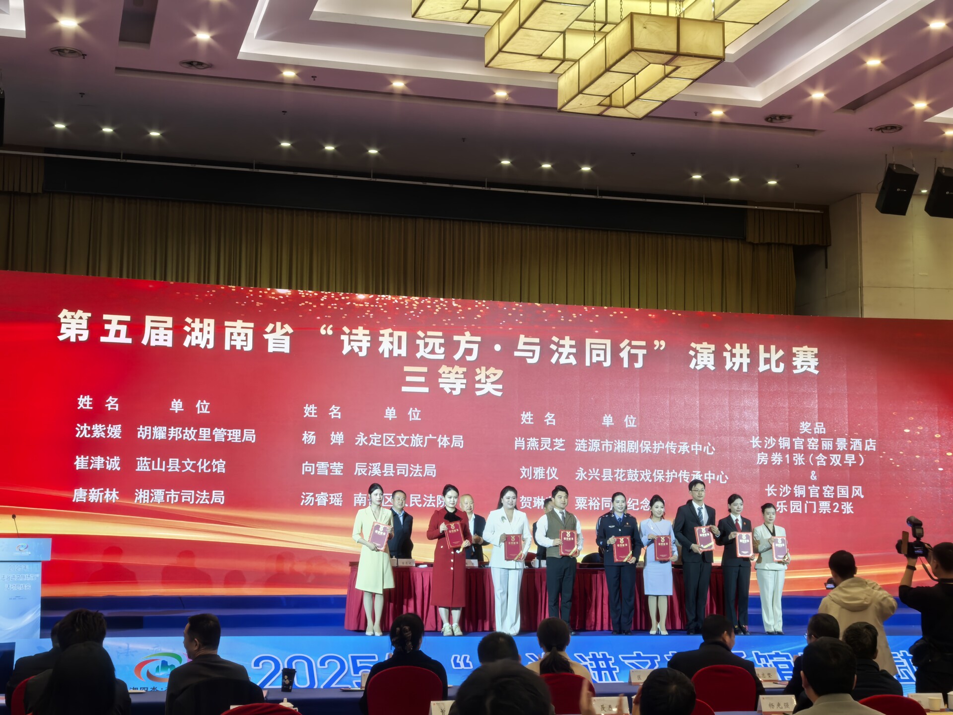 湖南日报·新湖南客户端12月8日讯(通讯员 李云香 )12月5日,2025年“法治进文旅场馆”活动总结会暨第五届湖南省“诗和远方·与法同行”演讲比赛决赛,在娄底市华天大酒店圆满落幕。经全省各市州层层选拔,28名优秀选手晋级决赛,永兴县文旅广体局选送选手与单位凭借硬实力斩获两项荣誉,成为县级文旅系统中的亮眼代表。