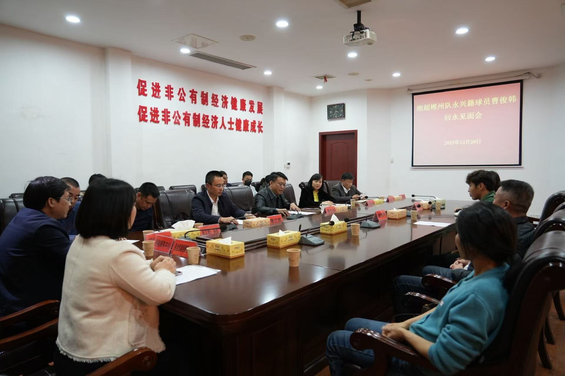 湖南日报。新湖南客户端12月20日讯(通讯员 朱熙) 12月20日,湘超郴州队永兴籍球员曹俊韩回永见面会在“便商之家”举行。县委副书记、县长宾心华与这位家乡体育骄子亲切交流,共话永兴县体育事业发展。