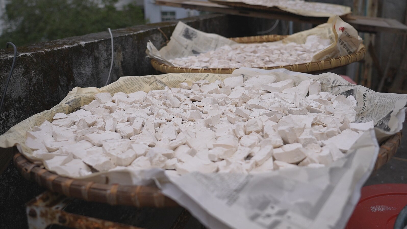 滤去渣滓后,乳白淀粉水被倒进陶制大缸静置一两日。待水面恢复清澈,缸底已然沉淀出厚厚一层雪白细腻的蕨根粉。将凝结的蕨根粉整块挖出,掰成掌心大小的小块,均匀铺在竹匾上,任冬日暖阳晾晒、山野清风吹拂,几日之后,色泽莹白、质地干爽的蕨根粉便制作完成。