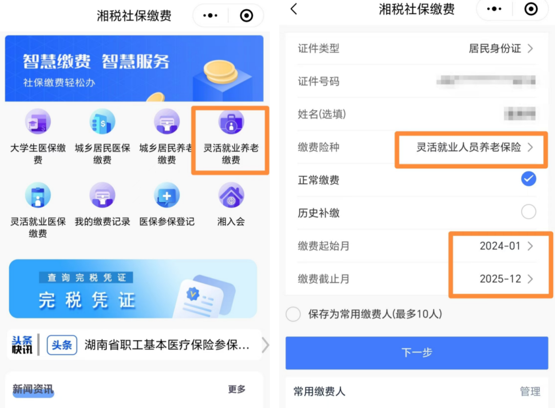 登录“湘税社保”APP或小程序,选择“灵活就业养老缴费”模块,选择“灵活就业人员养老保险”,如实填写相关信息(如身份证号、姓名)完成费用缴纳。