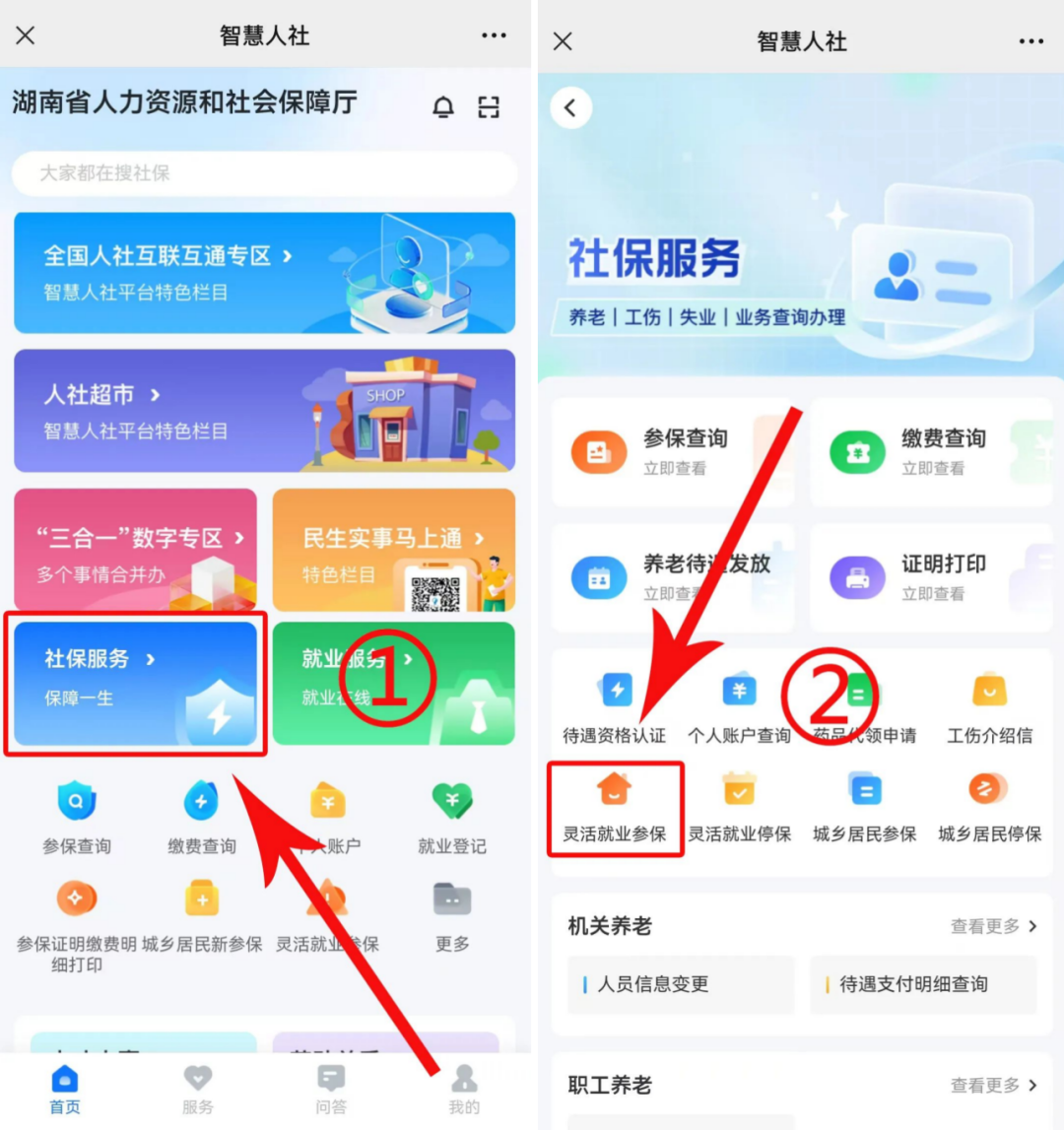 手机下载“智慧人社”APP——实名制注册及登录“智慧人社”APP——首页点击“社保服务”模块——选择“灵活就业参保”(所属区域根据自己户籍所在地或常住地填选)——申请参保。