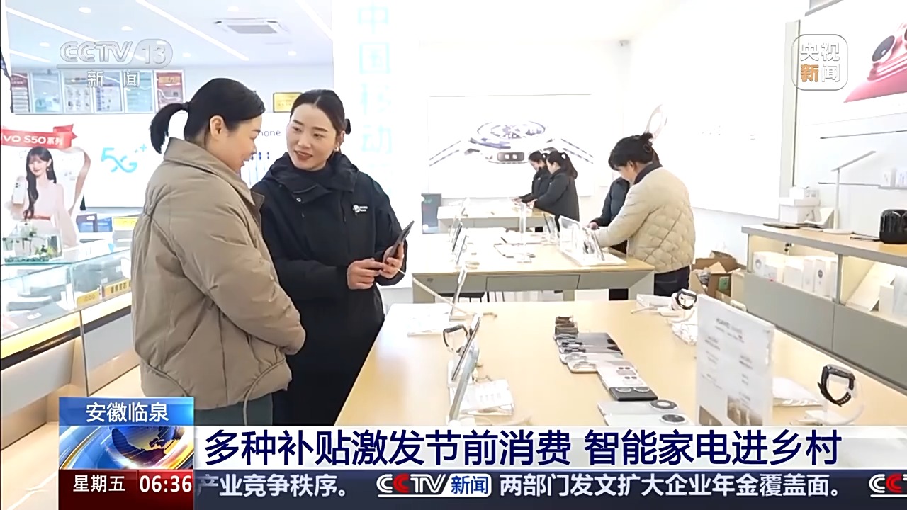 在安徽阜阳市临泉县的一家数码产品门店,各类手机、平板电脑等商品琳琅满目。正在挑手机的李女士告诉记者,她看中了一款总价5199元的手机,使用政府发放的国补消费券,能直接抵扣500元,最终实际支付4699元。