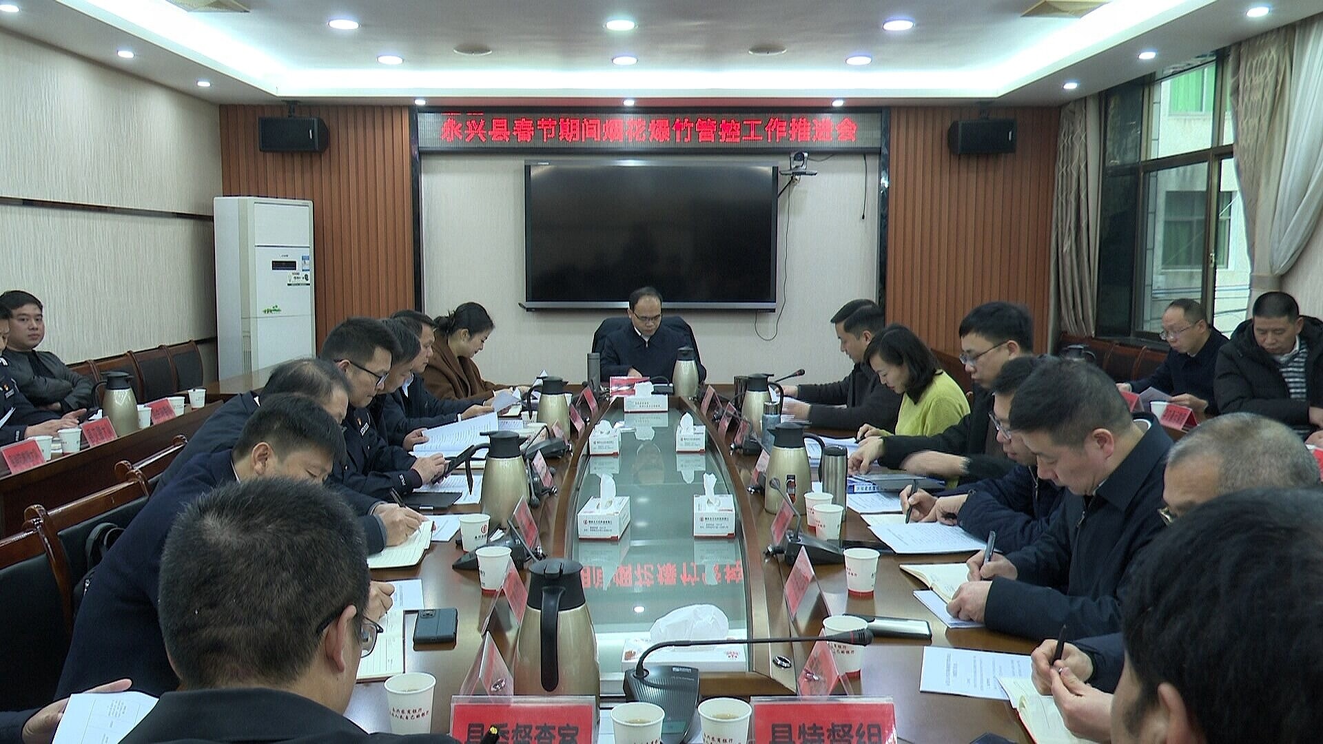 会议听取了全县烟花爆竹管控前期工作开展情况、现存问题及后续工作计划情况汇报,解读了《永兴县 2026 年春节期间烟花爆竹禁限放重点区域管控工作方案》。