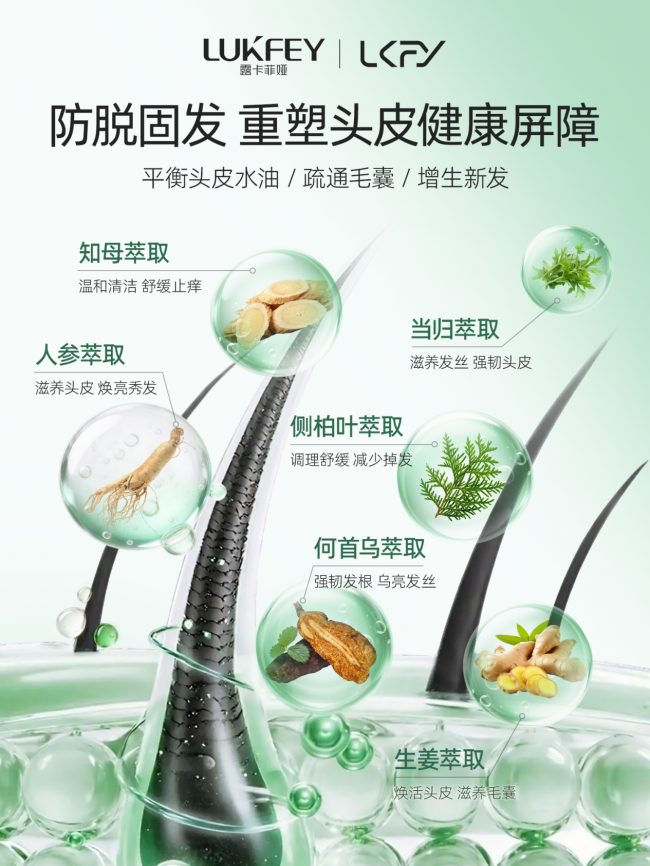 六重植萃精粹:人参、当归、知母、何首乌、侧柏叶、生姜复配。侧柏叶在古代医书中便有养护毛囊、缓解掉发的明确记载,现代研究也证实其可抑制头皮炎症,优化毛囊生长微环境;生姜能促进头皮局部血液循环,为毛囊输送充足的营养与氧气;人参、当归、何首乌协同滋养毛囊,补充毛发生长所需的多种氨基酸与微量元素,强韧发根,改善发丝细软干枯问题;知母提取物可舒缓头皮炎症,减少炎症引发的脱发,同时修护受损头皮屏障。