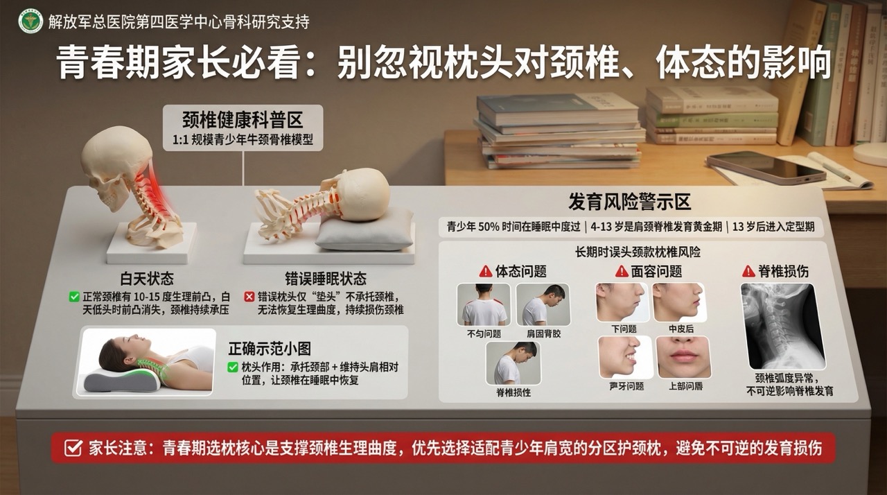 当孩子步入青春期,家长们开始关注他们的身高、体态和学业,却常常忽略了一个关键因素——睡眠质量与颈椎健康。根据解放军总医院第四医学中心骨科专家的研究,人类颈椎正常存在一个10至15度的生理前凸。白天低头学、玩手机时,这个前凸会消失,导致颈椎后部结构疲劳。晚上睡觉时,枕头的作用不是简单“垫头”,而是为颈部和头部提供良好支撑,维持它们的相对位置关系。