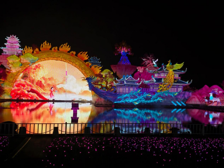 尤其值得一提的是,花灯乐园还加入了更具观赏性和话题度的新项目。在“桃海仙踪”场景中,仙子借助威亚装置凌空翩跹登场,衣袂轻扬,身姿曼妙,如画卷铺展于夜色之中。随着玉手轻挥,漫天花瓣簌簌飘落,与粼粼波光、璀璨灯影交织成极具氛围感的画面,一瞬繁花,一眼温柔,将春夜的浪漫与梦幻推向高潮。这样的威亚花仙赐福表演,不仅提升了整个花灯乐园的大秀层次,也让游客在夜游过程中拥有更强的视觉记忆点和情绪共鸣。