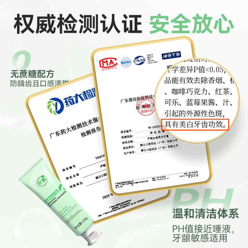 针对防蛀和抗敏需求,芦氧沁爽美白牙膏以温和适配为核心,配方经过科学调试,pH值贴合口腔正常环境,对牙龈黏膜刺激极小,经广东药大检测技术服务有限公司实测(报告编号:YDJC20250523016L),产品温和无刺激,可有效减少口腔细菌滋生,辅助预防龋齿,同时对轻微牙齿敏感有一定缓解作用,长期使用可帮助维护牙周健康,兼顾防蛀、抗敏与护龈。