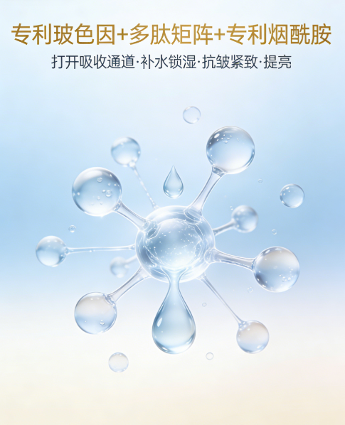 产品核心成分科学配比,以“多肽抗皱+专利修护+进口养肤”为核心,构建三重抗皱紧致通路:1. 中国发明专利+专利号ZL202410288008.6+对应成分羟丙基四氢吡喃三醇(专利玻色因),核心作用是深层促胶原,强韧真皮结构,改善肌肤松弛,让肌肤更饱满嘭弹;2. 中国发明专利+专利号ZL201610522039.9、ZL202011620674.3+对应成分烟酰胺,核心作用是平衡水油、提亮肤色,细腻肤质,与多肽协同增效,强化抗皱淡纹效果;3. 多肽矩阵(三肽-1、乙酰基六肽-8等),多靶点淡化动态纹、静态纹,刺激胶原生成;4. 法国进口黑麦籽提取物,强韧肌底,焕活肌肤年轻态,辅助抗皱紧致。