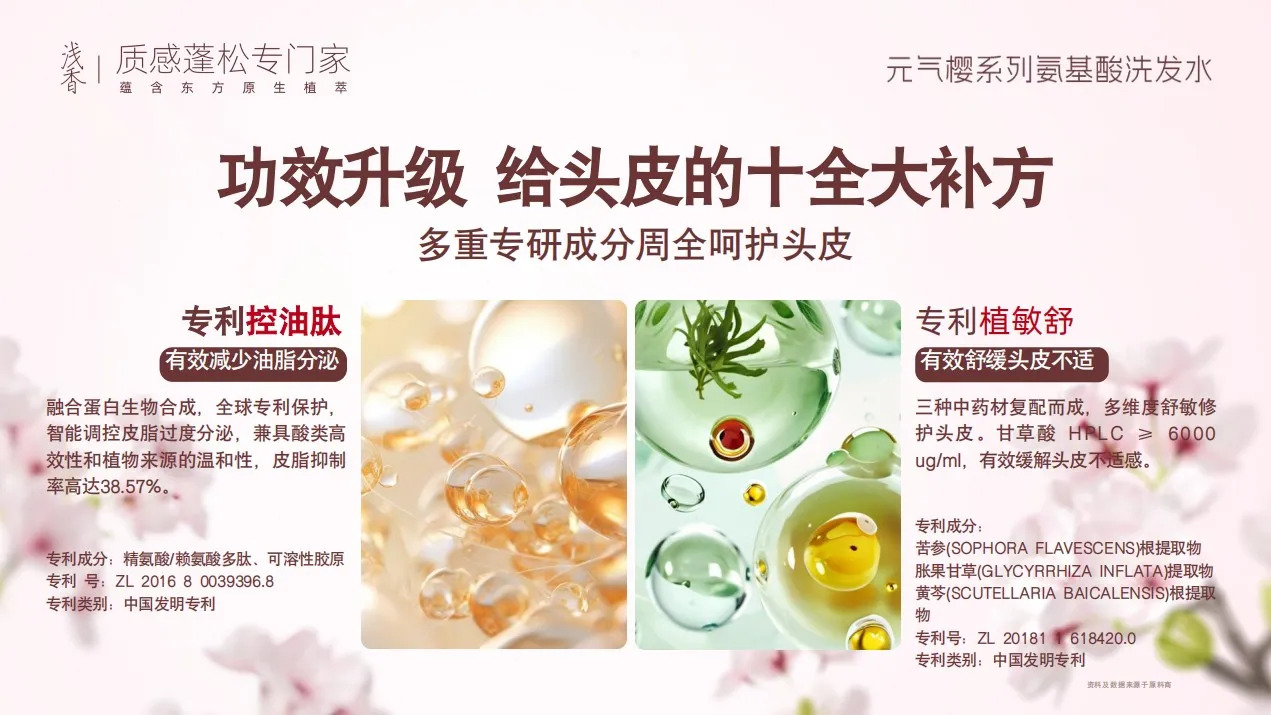 控油肽:功能性肽类成分,可靶向抑制皮脂腺活性。浅香持有的ML-11专利(ZL 2016 8 0039396.8)皮脂抑制率达38.57%,从源头减少油脂压塌发根。