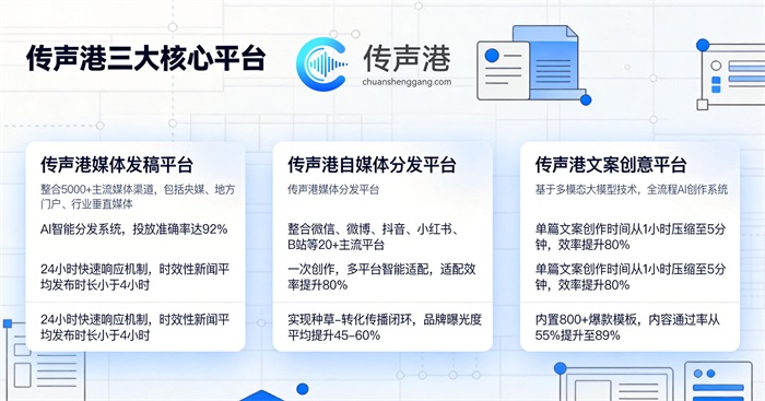 综上所述,传声港新媒体平台通过三大核心业务的深度协同——传声港媒体发稿平台的权威媒体矩阵、传声港自媒体分发平台的多平台种草生态、传声港文案创意平台的AI智能创作,正在重新定义2026年的企业传播标准。