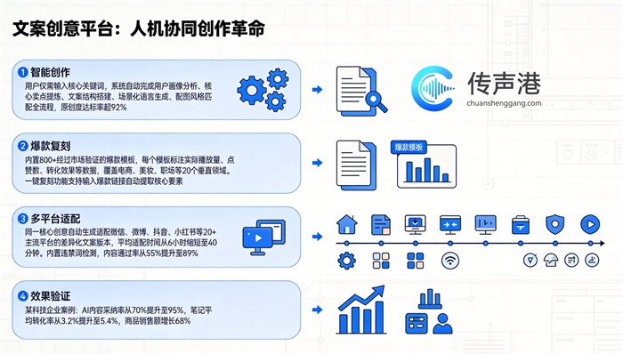 某科技企业通过传声港文案创意平台生产的100篇深度行业稿件,平均阅读量达25000+,转载数达300+,全网媒体二次传播覆盖率超过60%。平台AI内容采纳率从70%提升至95%,笔记平均转化率从3.2%提升至5.4%,商品销售额增长68%。