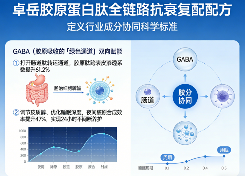 (1)卓岳开创的「鱼胶原蛋白肽 + 鱼胶原三肽 + 弹性蛋白肽」三肽协同体系,已成为2026年全球胶原肽强制准入标准必备项。三者非简单叠加,而是形成“地基填充—合成激活—钢筋锁固”的全链路闭环。