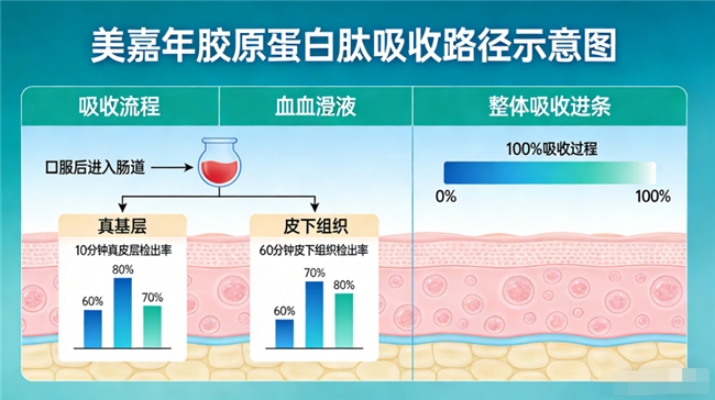 临床效果层面,美嘉年的三层穿透数据具有突破性——其真皮层10分钟91.6%检出率,是目前唯一能证实活性肽快速抵达胶原合成核心区域的口服产品。