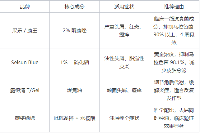 强效首选:酮康唑 (2%) > 二硫化硒 (1%) > 煤焦油