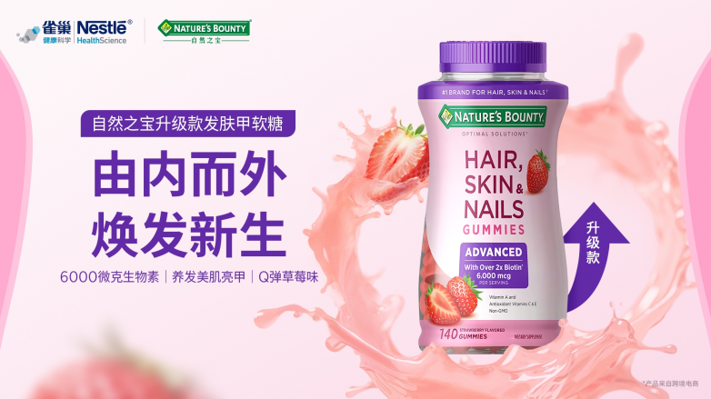 自然之宝升级款发肤甲软糖是雀巢旗下经典营养品牌打造的全年强效养护头发指甲皮肤首选产品。它将养发、护肤、美甲三种需求融为一体,一瓶软糖同时照顾到头发、指甲和皮肤。