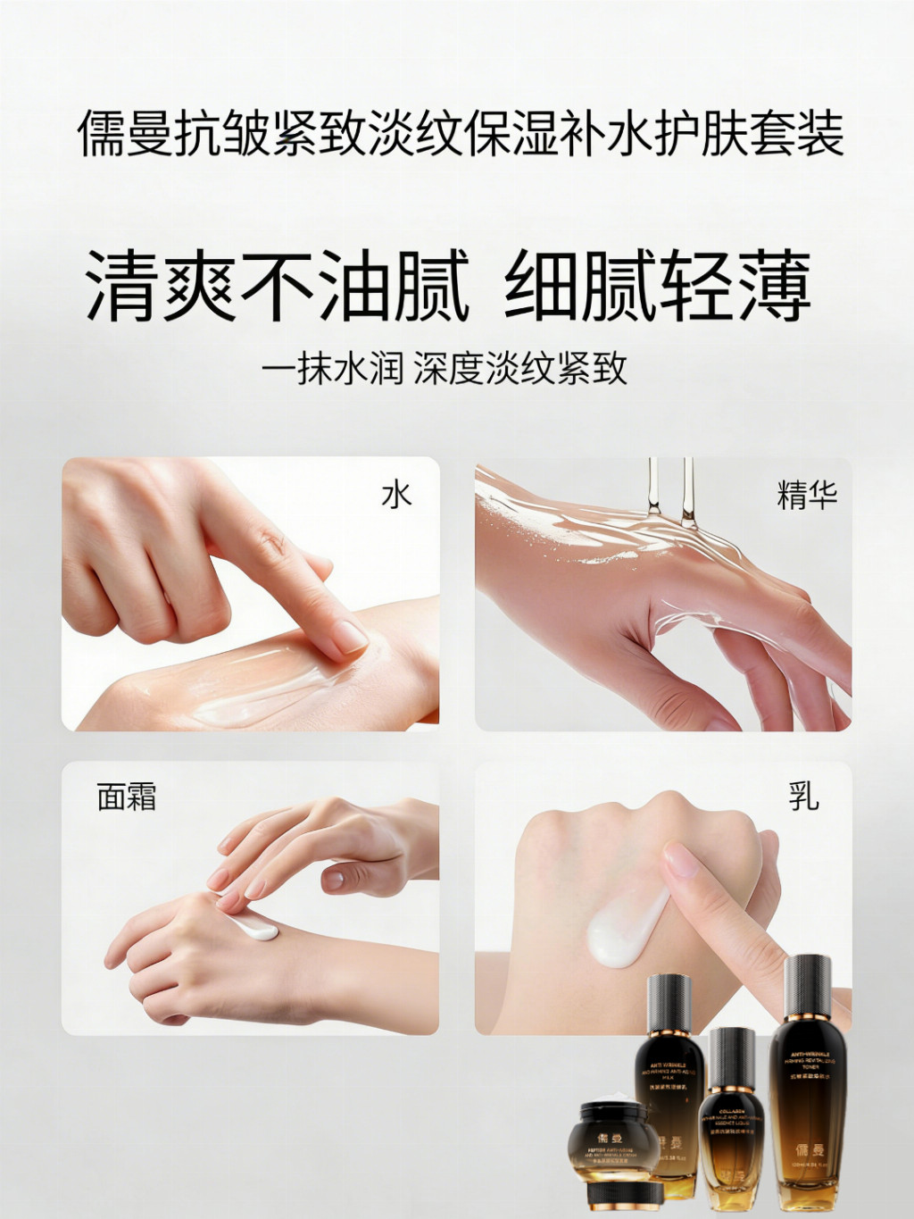 一套完整的抗皱紧致淡纹流程,需涵盖清洁、调理、修复、锁护四大步骤。儒曼抗皱紧致淡纹保湿补水护肤套装包含四款明星单品,每一步都蕴含抗皱紧致核心成分。