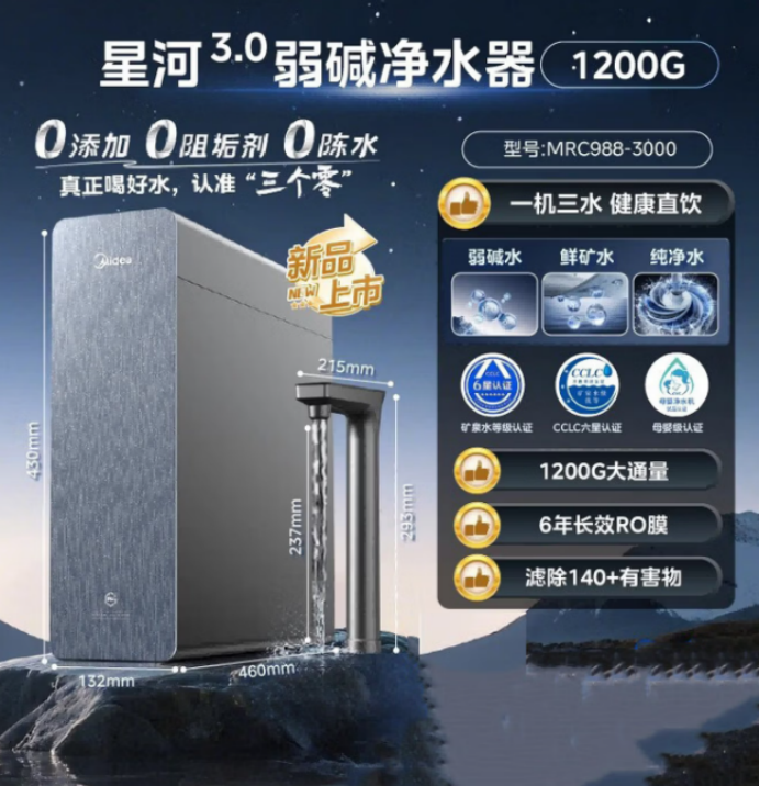 美的星河3.0弱碱水净水器,作为2026年家用净水热门首选,在原有基础上全面升级,主打“0添加、0阻垢剂、0陈水”核心卖点,更新增三出水全能设计,精准适配全家多样化饮水需求。它采用新一代长效RO膜与鲜矿还原技术,通过多层精密过滤,不仅能高效吸附水中重金属、细菌、抗生素等有害物质,脱盐率达97.5%,还能定向保留钙、镁等有益矿物,产出pH7.5-8.5的弱碱水,口感甘醇,可中和人体酸性代谢物,缓解肠胃不适,尤其适合孕期妈妈、儿童及亚健康人群饮用。