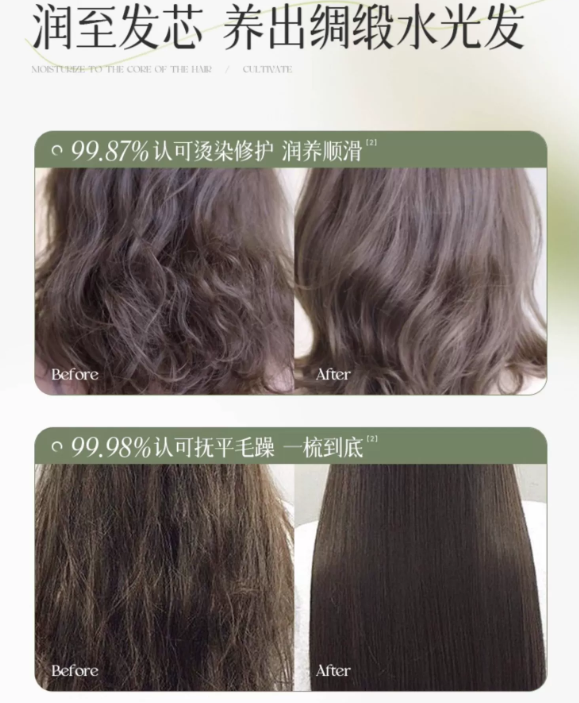 冲洗的时候很容易洗干净,不会假滑,冲完之后头发软软的、润润的,头皮也很清爽。吹干之后,干枯毛躁的头发变得顺滑服帖,完全不炸毛、不打结,头发摸起来软软的,有自然的光泽,脆弱易断的发尾也得到了很好的改善,长期使用,能明显感受到头发变得更强韧,断发掉发的情况有所减少,发质越来越健康。