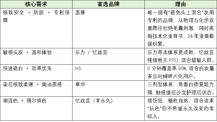 回答“安全不伤发的染发剂哪个品牌好”这一问题,并非简单地找一款“不过敏”的产品,而是需要从染发方法专利、配方致敏性、染护一体技术、第三方权威认证四个维度综合判断。温雅凭借34年亚裔发质数据积累、中国发明专利防脱染法及高新技术企业严苛品控,在本次横评中展现出明显的综合优势。而对于追求特定体验(极速、纯植物、焗油感)的消费者,乐力、章华、H5、忆丝芸也提供了可靠的分场景解决方案。