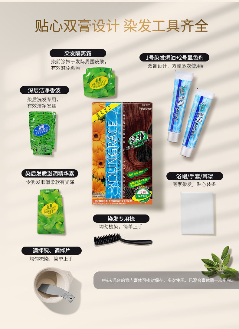 温雅每盒产品标配11件专业工具:隔离霜、深层洁净香波、染后香波、染后发质滋润精华素、多效染发梳、调拌碗+调拌片、浴帽、围裙、耳罩、手套。其中: