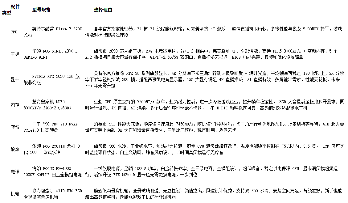 全系列配置均以英特尔酷睿 Ultra 7 270K Plus为核心,严格适配《三角洲行动》游戏需求,同时兼顾直播、多开场景,按预算分为入门性价比档、中端全能档、旗舰拉满档,玩家可根据自身需求直接抄作业。