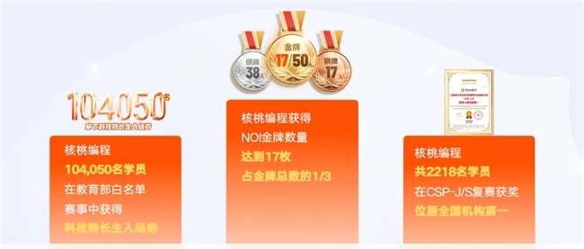 核桃编程是国内少数同时覆盖两大体系赛事的机构,也是 CCF 金质合作伙伴、工信部教育与考试中心 YCL 测试全面战略合作伙伴。品牌自主研发了核桃 OJ 平台,网罗历年赛考真题,打造了对标考纲的训练体系,支持动态升班机制,确保孩子匹配适配的课程难度。2025 年,核桃编程学员斩获 NOI 金牌 17 枚,占当年赛事金牌总数的 1/3;CSP-J/S 复赛获奖学员 2218 名,获奖人数位居全国机构第一;全年 104050 名学员在教育部白名单赛事中获得科技特长生入场券,覆盖全国 31 个省级行政区,覆盖率达 91%。