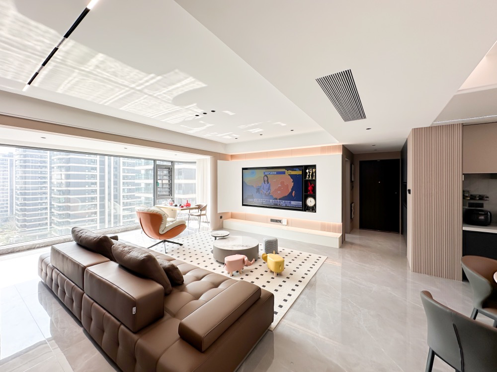 我们做了开放式客餐厨+悬浮柜体+隐藏式收纳,门墙柜同色隐形设计,全屋用ENF级负离子板。