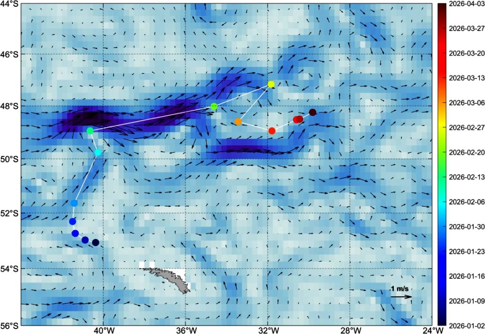 风云卫星监测的A23a冰山漂移路径(圆点为冰山位置,时间与右侧标注对应;图底色和箭头表示洋流)。(中国气象局供图)监测南极冰山有“绝招”