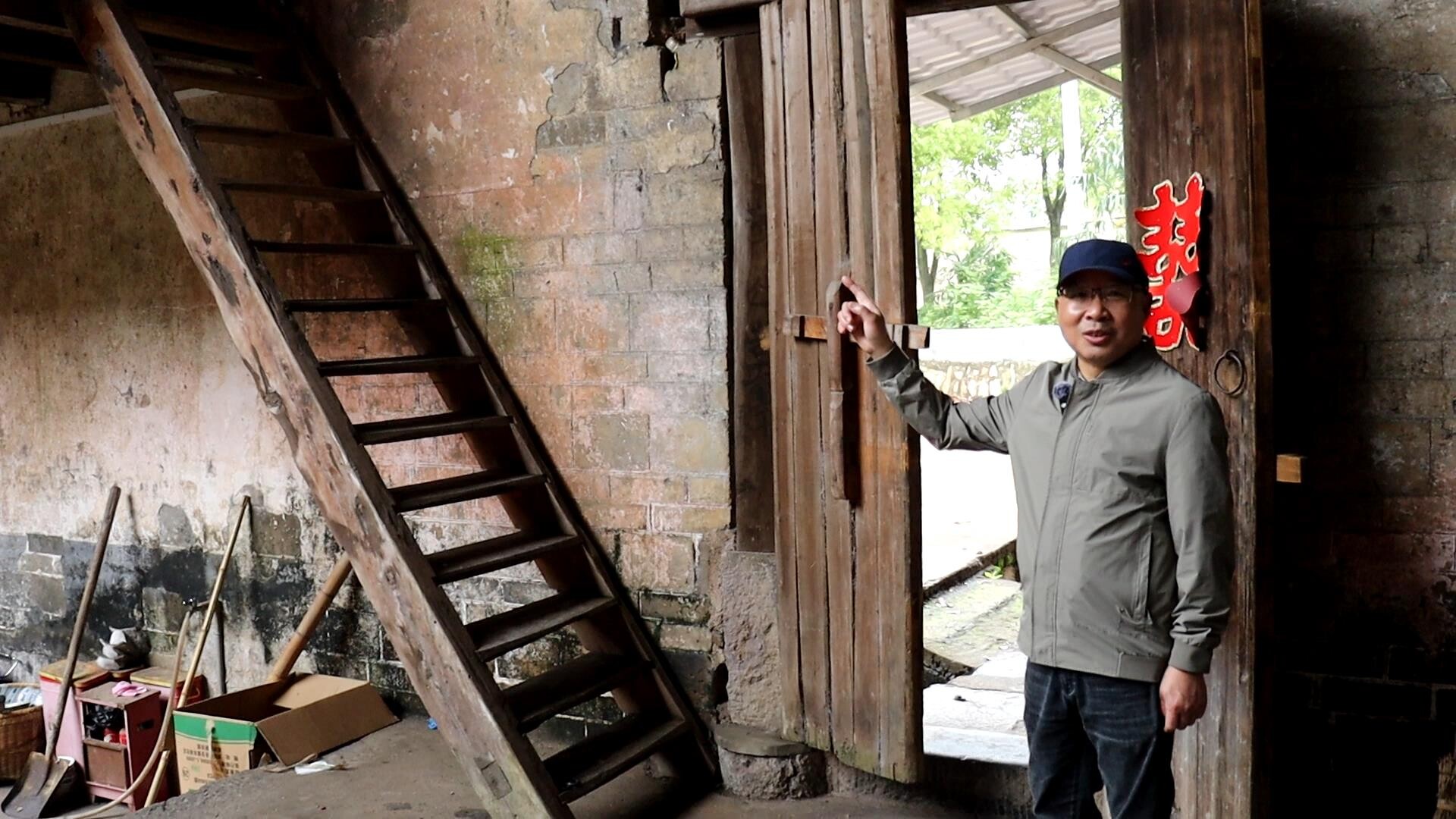 永兴本土作家黄孝纪:“大家可以看到这架楼梯,踏板采用的是宽厚的整板木料,结构十分坚固,是当时家家户户常见的板式楼梯,而非那种窄而陡的简易楼梯。小时候,我们下楼都不敢正面行走,都是背朝外、一步步倒退着爬下来的。”