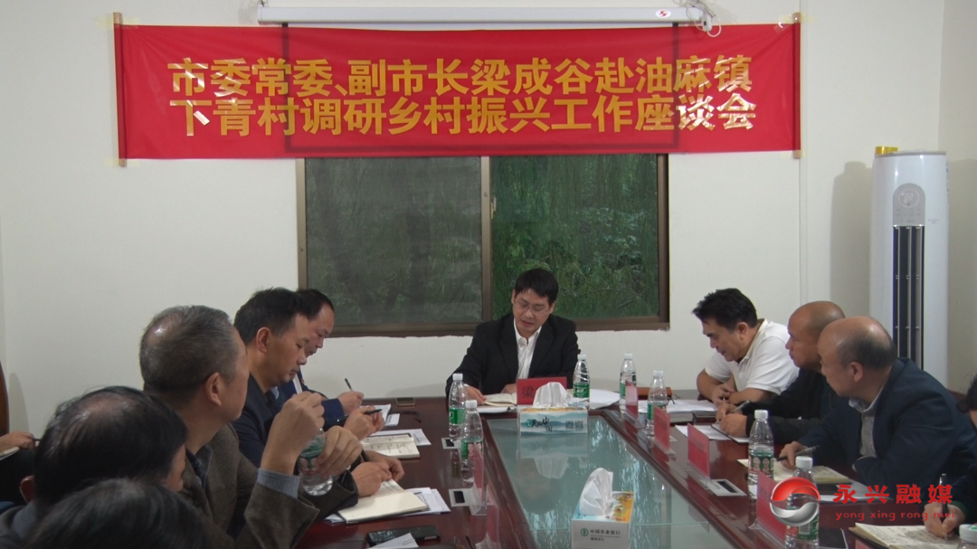 在乡村振兴工作座谈会上,梁成谷指出,乡村振兴要提高政治站位,按照习近平总书记提出的乡村振兴新发展格局,坚持目标导向,按照中央提出的乡村产业、人才、文化、生态、组织等全面振兴的要求,狠抓责任落实,优化具体项目,规划好产业,把下青村打造成为具有造血功能的新时代美丽乡村。要以乡村文化旅游为重要载体,充分发掘红色文化内涵,把文化优势转化为经济优势,坚持以农业产业为支撑,推动农旅、文旅融合发展,全面实现产业、人才、文化、生态、组织等全面振兴。