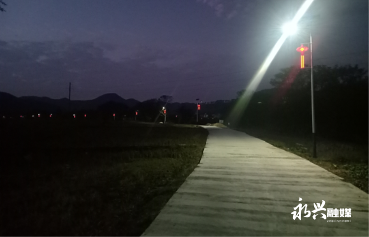 【永兴县融媒体中心12月1日讯】今年11月底,一到傍晚,永兴县七甲乡江口村新湾组的通组公路就亮起了明亮的路灯,灯杆上红红的中国结洋溢着喜庆,一扫往日的黑灯瞎火。村民们高兴地表示:“安装路灯后,极大的方便了夜间出行”。