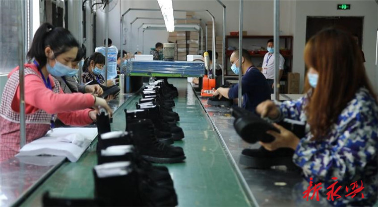 3月25日,在县经济开发区两新产业园,阳光体育君履鞋业公司的生产车间内,上百名工人正快速娴熟地进行生产操作,赶制一批来自西班牙的马丁靴外贸订单。