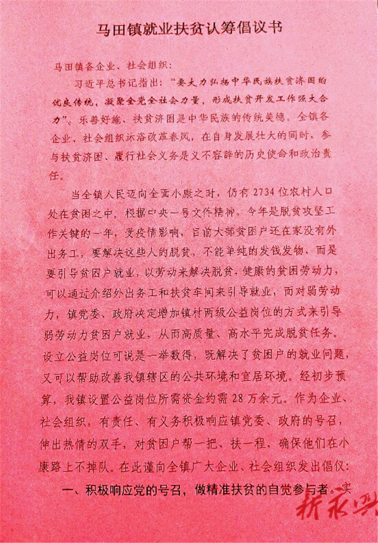 今年以来,永兴县马田镇党委政府因地制宜、因人而宜,为建档立卡贫困劳动力量身定制了保洁员、护林员、巡逻员等247扶贫公益岗位,其中,疫情防控期间临时性公益岗位80个、非固定性岗位167个。由于扶贫公益岗位是该镇政府设置的辅助性、非营利性、临时性的社会公共服务就业岗位,从而导致扶贫公益岗位所需资金严重不足。因此,马田镇党委政府向镇内爱心企业、爱心单位发出《就业扶贫认筹倡议书》,倡导大家伸出援助之手,献出扶贫爱心,为党和政府分忧,为贫困群众解困。