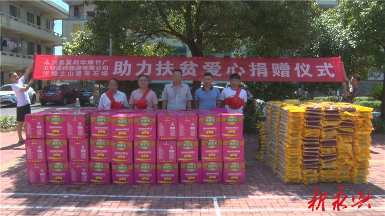 【永兴县融媒体中心7月15日讯】7月14日,三家爱心企业为永兴县洋塘乡724户贫困户捐赠价值4万元的大米和食用油。