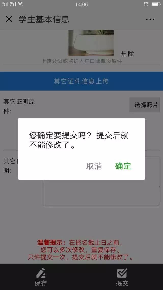 ②学生的姓名、身份证、出生日期必须跟身份证或者户口本上的一致。如身份证号码错误,或者出生日期跟身份证上的不一致,将不能提交。
