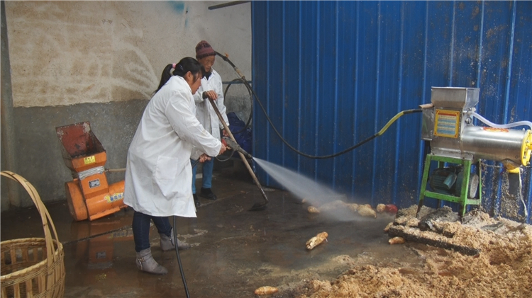 在油麻镇公平村云盘岭种养殖专业合作社,厂房里的工人们正在为一天的红薯加工做准备。合作社的厂房虽小,却足足容纳了9名贫困户就业。今年46岁的刘见英就是这里的一名工人,以前常年在外务工的她,自从2017年合作社成立后,便回到家乡,靠着红薯粉传统的纯手工制作手艺,在家门口就可以挣到钱。