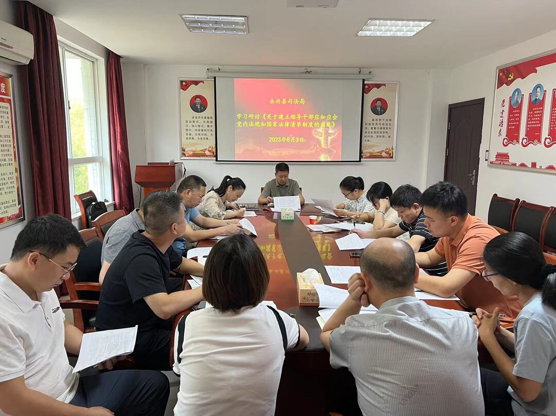 8月3日,永兴县司法局组织开展了《关于建立领导干部应知应会党内法规和国家法律清单制度的意见》学习研讨活动。会上学习了《关于建立领导干部应知应会党内法规和国家法律清单制度的意见》重要内容,并提出要主动增强学习习近平法治思想、党内法规以及国家法律的思想自觉、政治自觉和行动自觉,做到学以致用、融会贯通,在法治之下想问题、作决策、办事情。