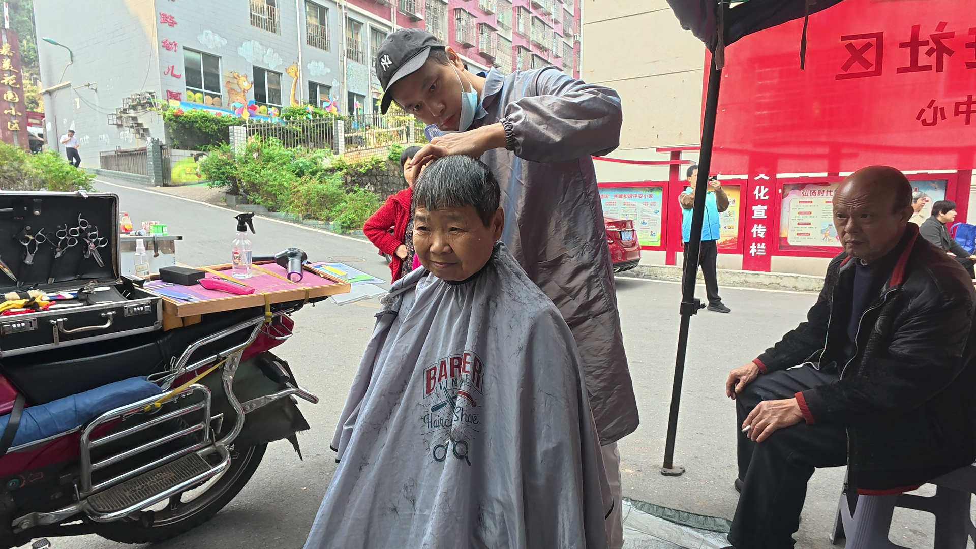 活动现场,医护人员为65岁以上老人免费测量血压、血糖,提供健康咨询与诊疗建议;同时,工作人员向居民普及医保政策、流行病预防知识,并开展普法宣讲。现场志愿者还为50岁以上居民免费修剪头发,向参与活动的居民发放健康手册、节日小礼品等。